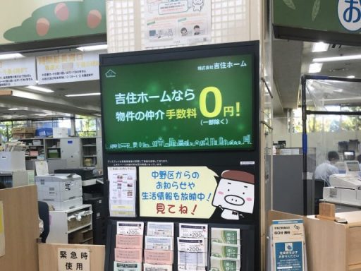 中野区役所内デジタルサイネージにて広告の放映開始 2022年11月22日 最終更新日時 : 2022年11月22日 編集者 本日より、中野区役所1階のお手続き窓口に設置されているデジタルサイネージにて、吉住ホームの映像広告の展開が始まりました。 中野区役所の1階窓口へお越しの際は是非ご覧ください。