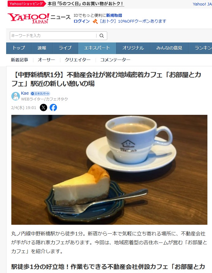 Yahoo!ニュース【中野新橋駅1分】不動産会社が営む地域密着カフェ「お部屋とカフェ」駅近の新しい憩いの場